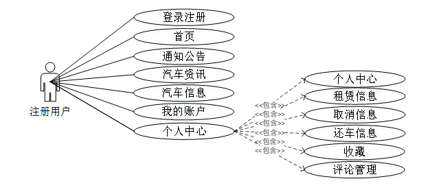 注册用户具备登录注册、首页、通知公告、汽车资讯、汽车信息、我的账户、个人中心(个人首页、租赁信息、取消信息、还车信息、收藏、评论管理)等需求用例,详细用例图如图3-1所示。
