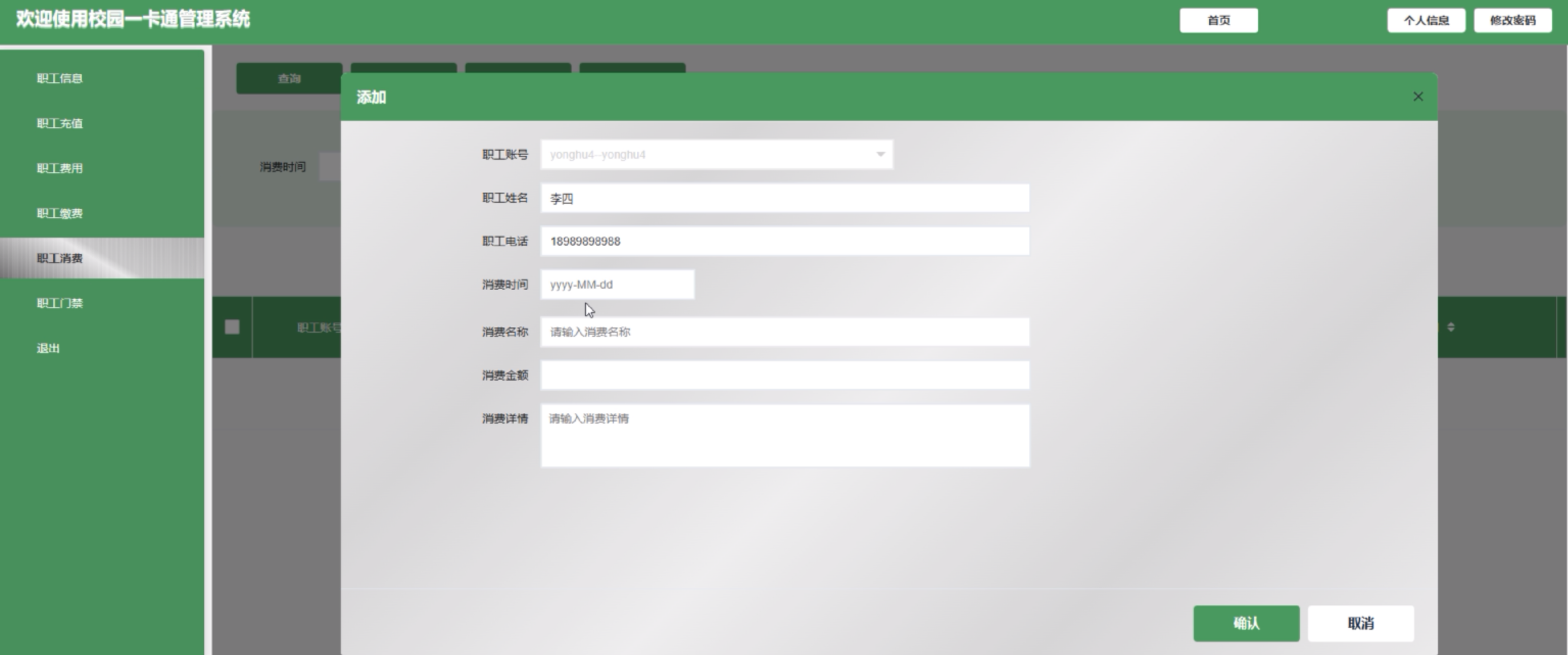 (6)职工消费:职工用户点击可新增消费信息,详情包括消费时间、消费名称、消费金额和消费详情。