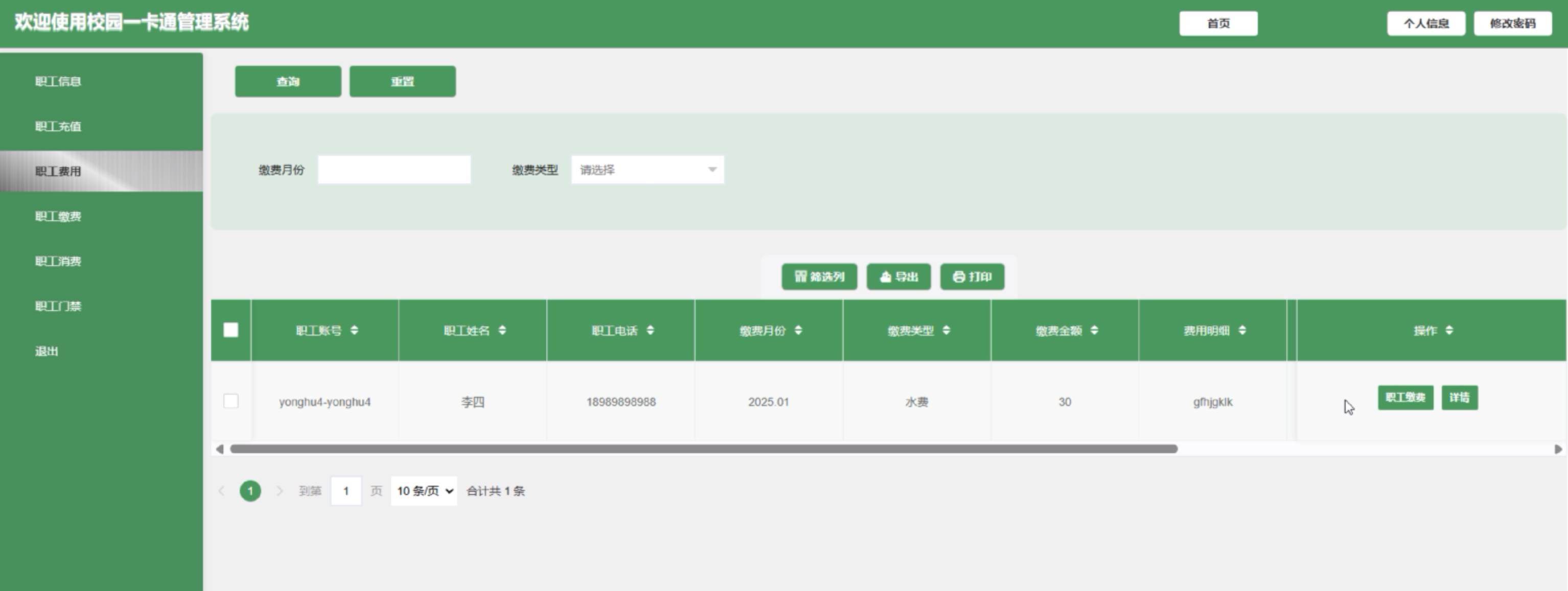 (4)职工费用:职工用户点击进入可通过搜索缴费月份、缴费类型进行查看职工费用信息列表,可点击“学生缴费”按钮添加缴费信息,包括缴费时间和缴费详情。