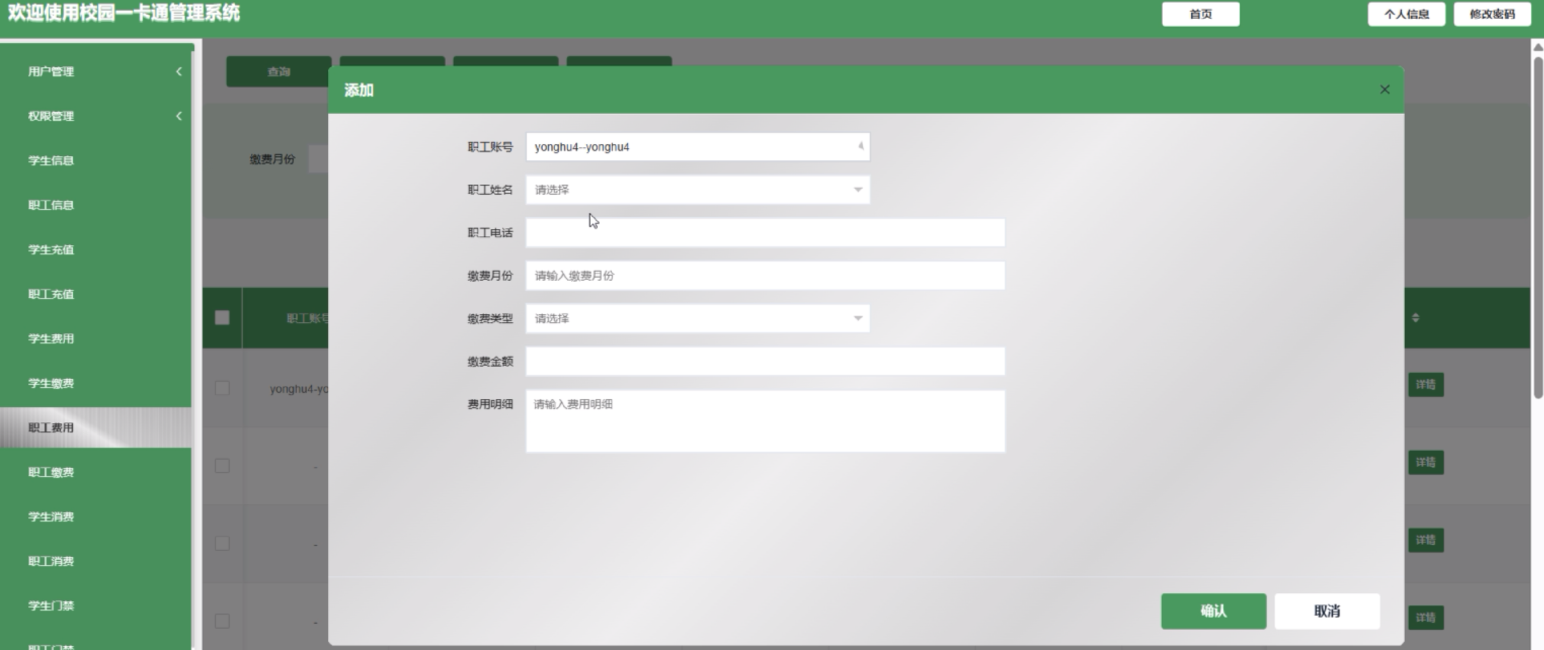 (10)职工费用:管理员点击可新增职工费信息,包括职工账号、职工姓名、职工电话、缴费月份、缴费类型、缴费金额和费用明细。