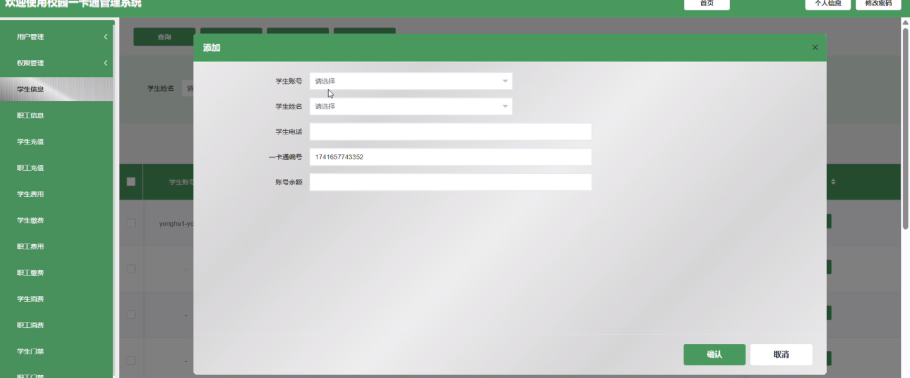 (4)学生信息:管理员点击可新增学生信息,详情信息包括学生账号、学生姓名、学生电话、一卡通编号和账号余额。