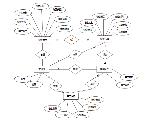 借助先进的系统,E-R图使其他用户可以快速轻松地了解系统的功能以及他们之间的关系。根据校园一卡通管理系统分析结果,本校园一卡通管理系统总体E-R图如下图所示。