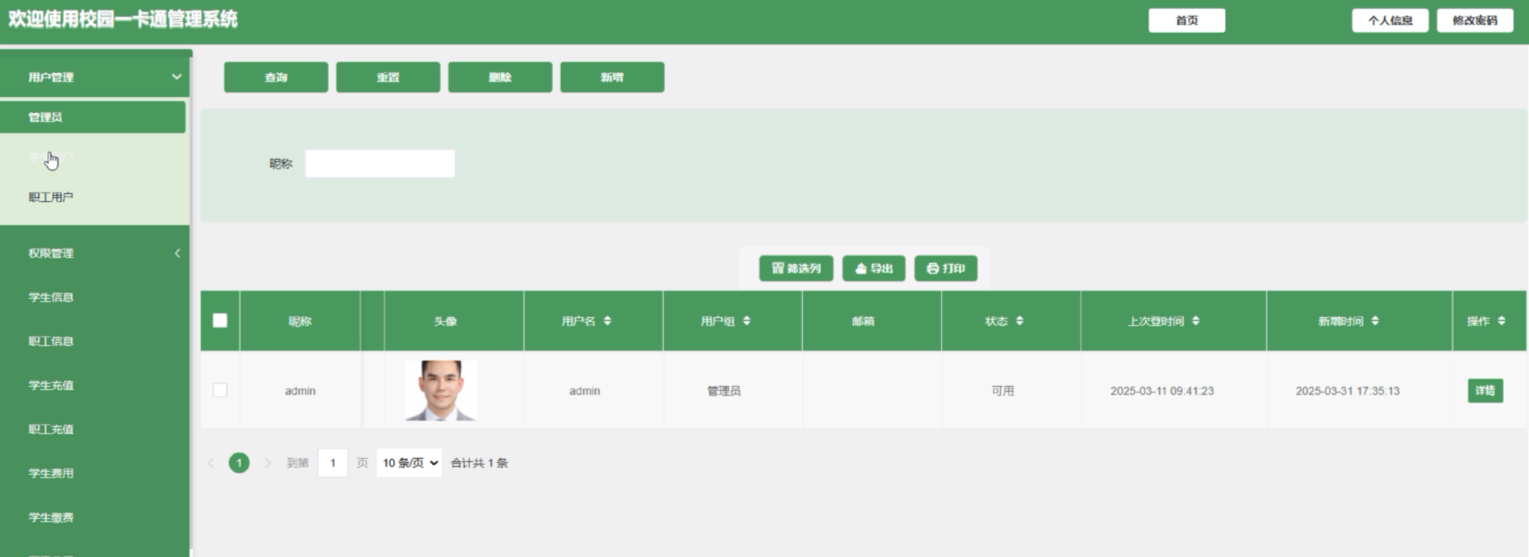 (2)用户管理:管理员点击可查看系统用户(管理员、学生用户、职工用户)列表中某个用户的详情,可以对用户信息进行查询、审核、添加和删除操作。