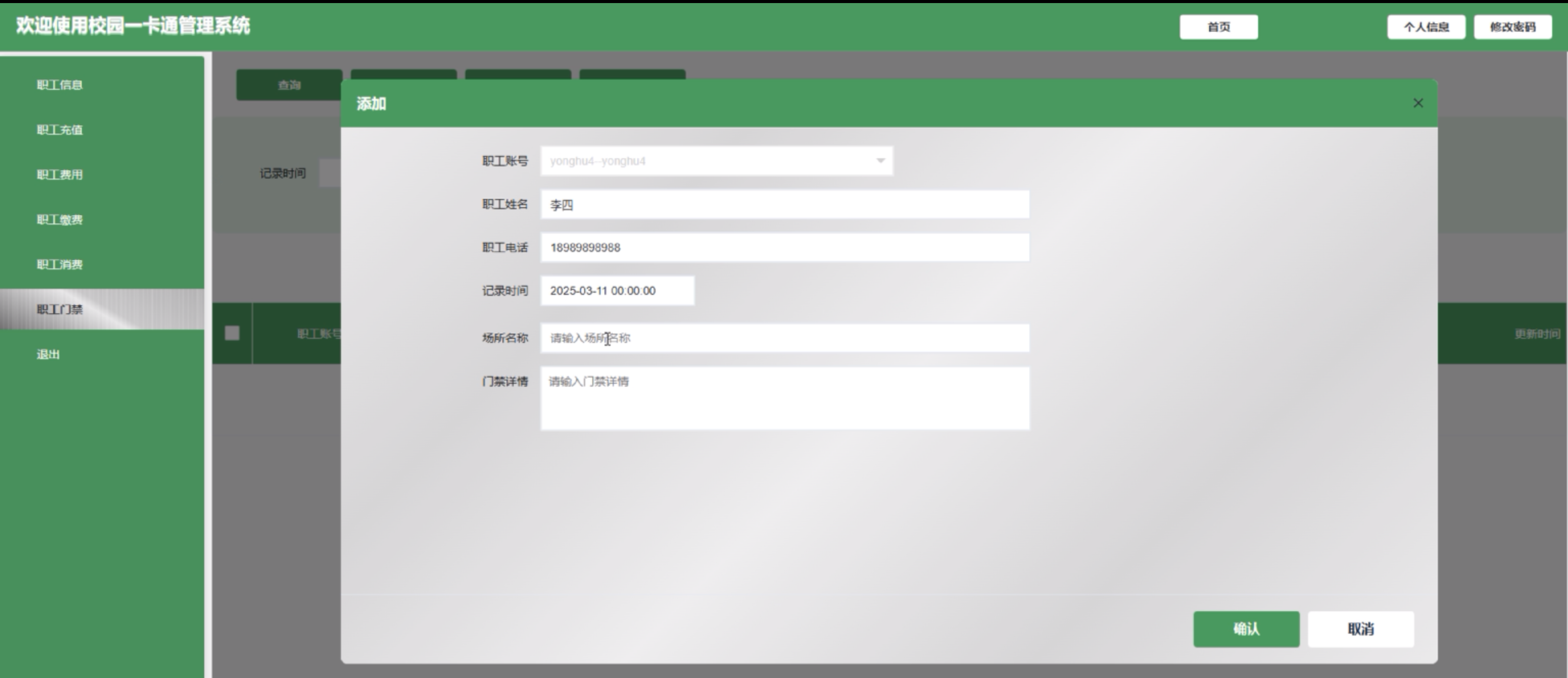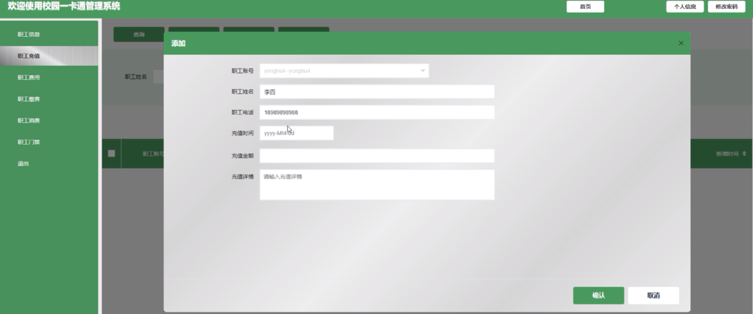 (5)职工信息:管理员点击可新增职工信息,详情信息包括职工账号、职工姓名、职工电话、一卡通编号和账号余额。