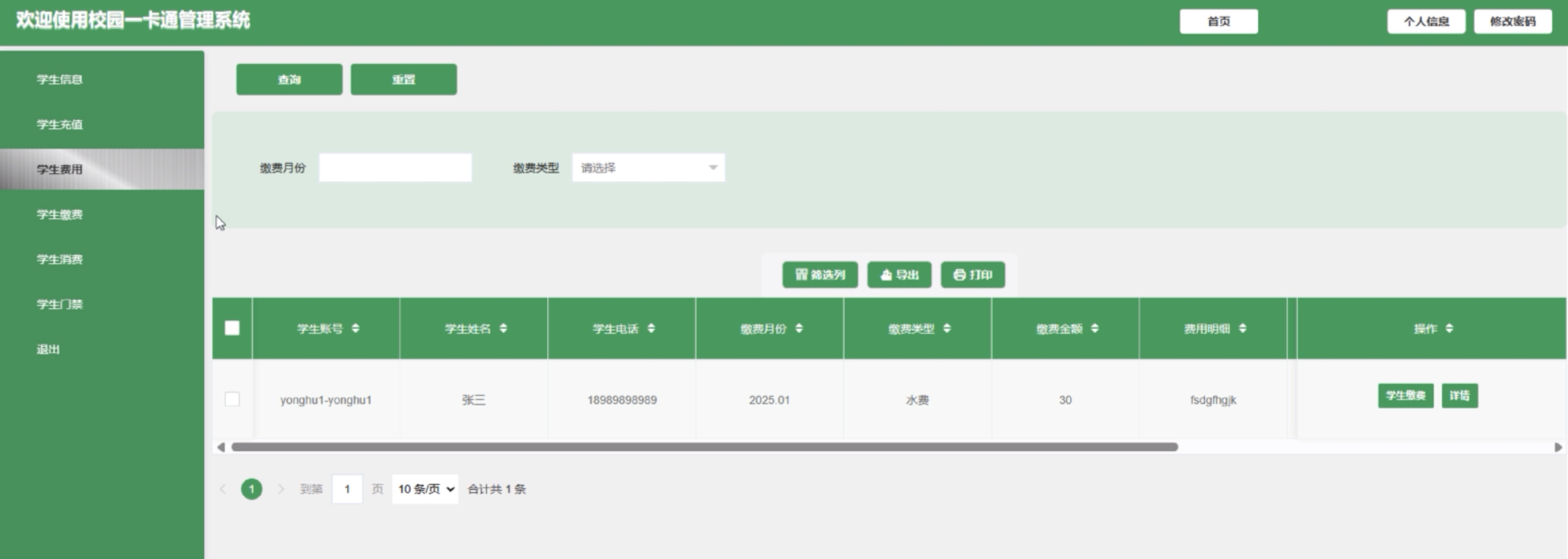 (4)学生费用:学生用户点击进入可通过搜索缴费月份、缴费类型进行查看学生费用信息列表,可点击“学生缴费”按钮添加缴费信息,包括缴费时间和缴费详情。