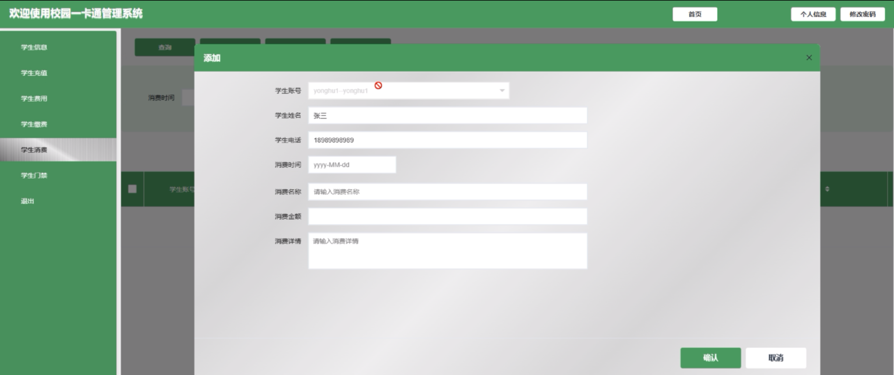 (6)学生消费:学生用户点击可新增消费信息,详情包括消费时间、消费名称、消费金额和消费详情。