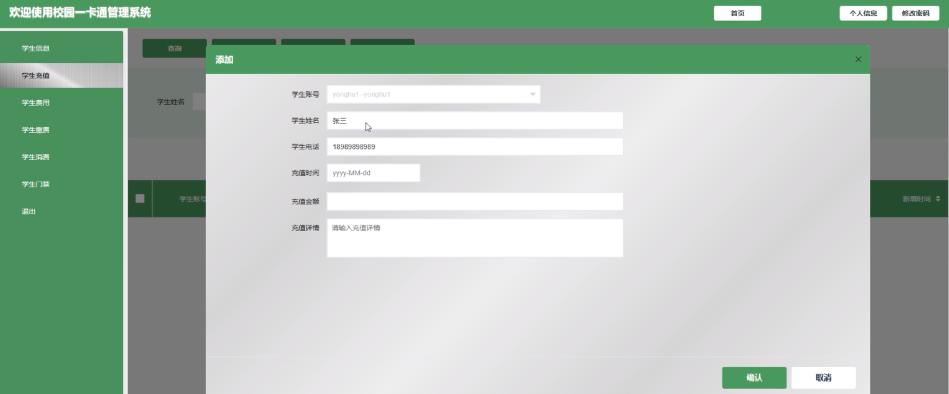(3)学生充值:学生用户点击可新增充值信息,详情信息包括学生账号、学生姓名、学生电话、充值时间、充值金额和充值详情。新增信息添加后,点击“支付”按钮进行充值支付。