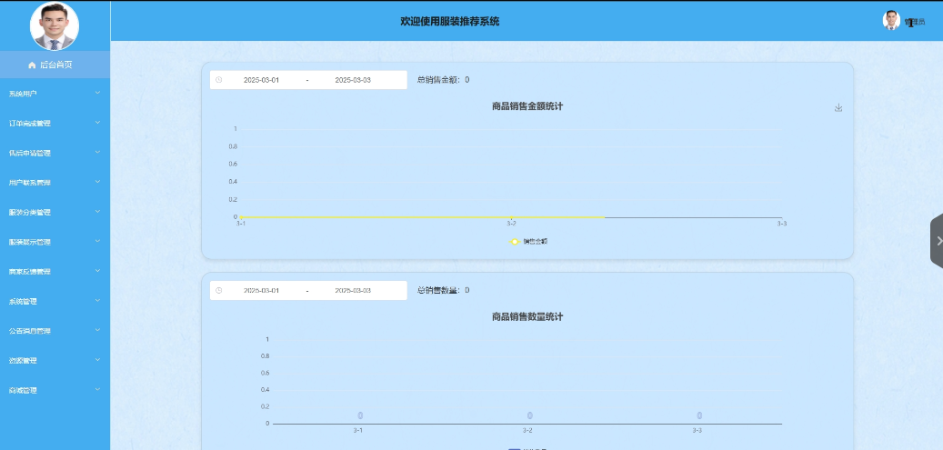 后台首页:管理员含有的功能有后台首页、系统用户、服装分类管理、服装展示管理、用户联系管理、商家反馈管理、商城管理、系统管理(轮播图管理)、网站公告管理、资源管理(服装资讯、资讯分类)等功能,同时呈现销售数量和金额统计图。