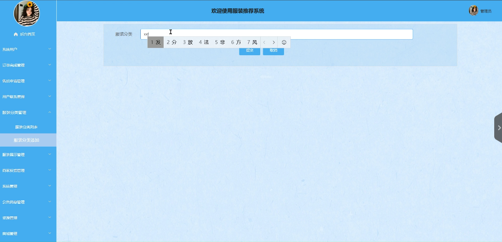 服装分类管理:管理员可以查看、编辑服装分类列表,也可以添加新的服装分类。界面如下图所示。