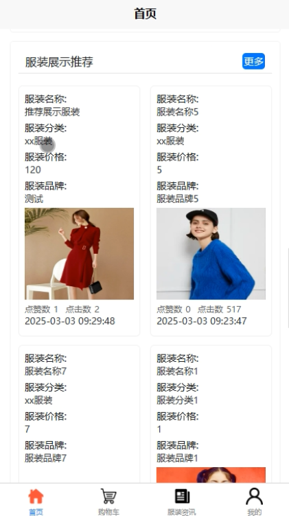 首页:展示系统的核心信息,包括热门推荐、服装资讯、服装展示等。用户可以在首页浏览和搜索服装展示。
