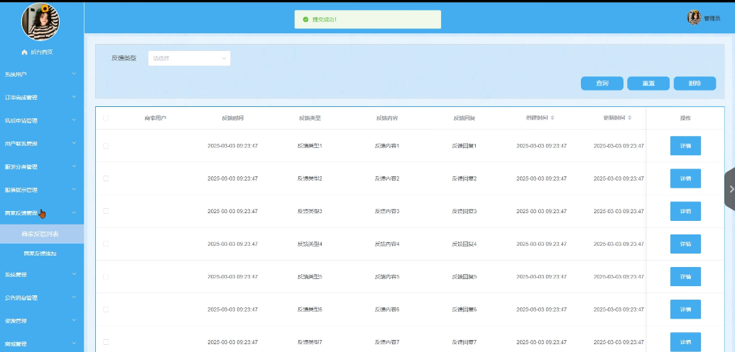 商家反馈管理:管理员可以查看、编辑商家反馈列表,也可以添加新的商家反馈信息。