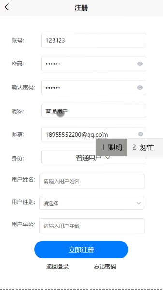 下表是注册功能测试用例,检测了各种数据的输入情况,观察系统的响应情况。得出该功能达到了设计目标。