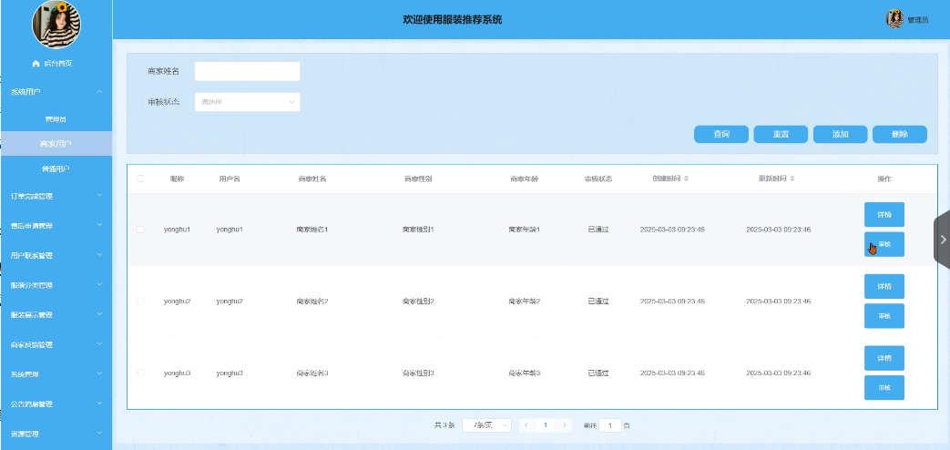 服装展示管理:商家用户可以查看和管理服装展示列表,也可以添加新的服装信息。