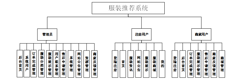 根据对系统的功能的分析,可以总结基于微信小程序的服装推荐系统的具体功能模块包括下面的几个主要的功能模块:该系统主要从两大模块进行设计的,首先就是用户参与操作需要的模块,此外还需要有管理员用到的模块,两者之间不是互相独立的,他们之间有着密切的联系,同数据库表中的数据连接起来进行操作。每个模块访问相同的数据库,但访问的表不同。系统的各个功能模块是根据所收集的资料研究得到的。在以上分析功能的基础上,系统模块分为多个模块。注册用户含有的功能有登录注册、首页、网站公告、服装资讯、服装展示、服装商城、我的等功能,商家用户含有的功能有后台首页、订单完成管理、售后申请管理、服装展示管理、商城管理、商家反馈管理等;管理员含有的功能有后台首页、订单完成管理、售后申请管理、服装展示管理、商城管理、商家反馈管理、服装分类管理、系统管理(轮播图管理)、网站公告管理、资源管理(服装资讯、资讯分类)等功能。