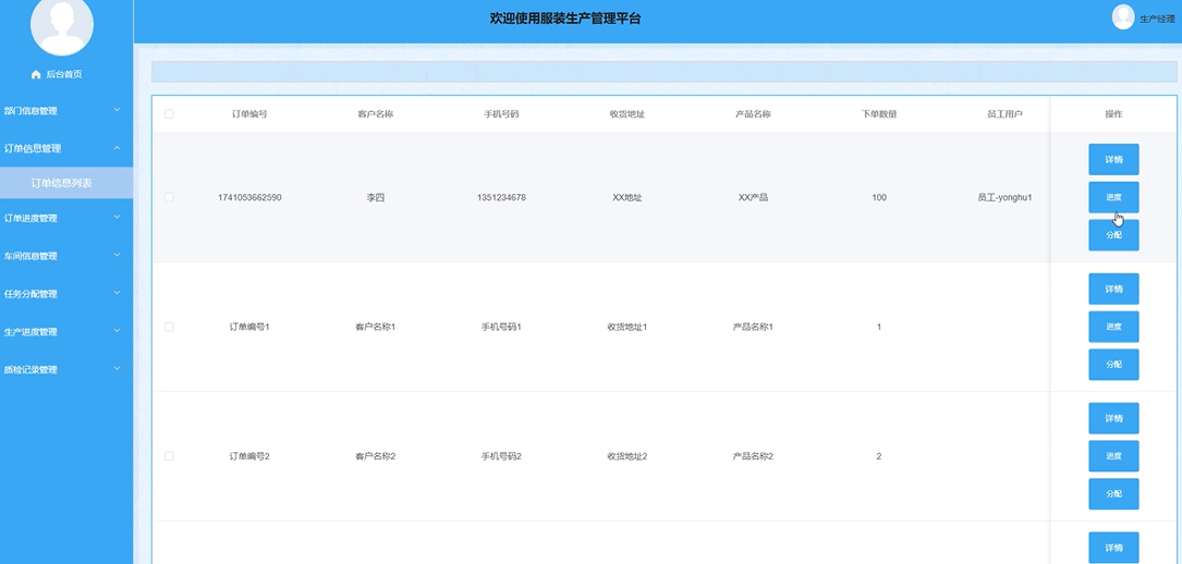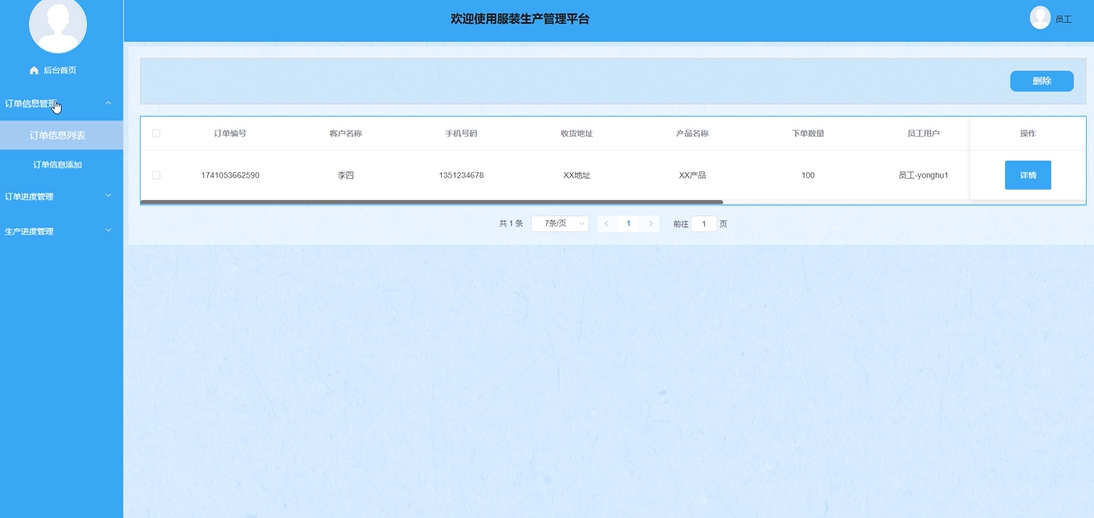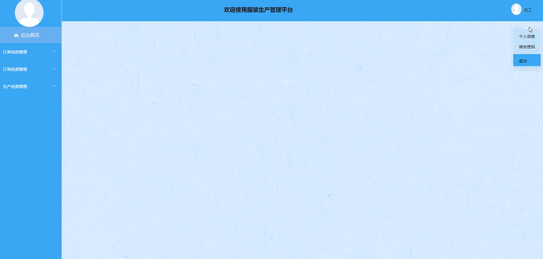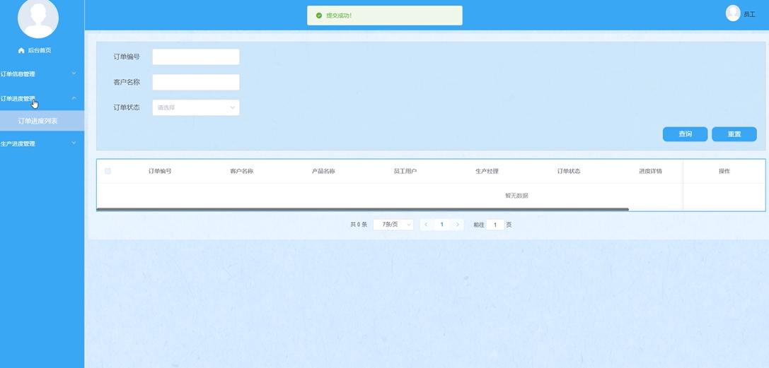 员工用户包含登登录、后台首页、订单信息管理、订单进度管理、生产进度管理等功能。
