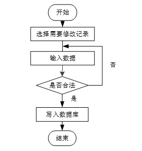 用户首先选择需要修改的记录,输入修改后的数据,系统判断输入数据是否合法。若数据不合法,提示重新输入;若数据合法,则将修改后的数据写入数据库,完成操作后流程结束。修改信息流程图如图3-7所示。