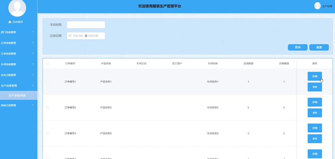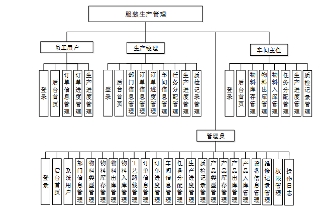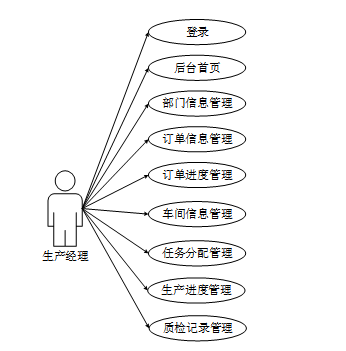 生产经理包含登录、后台首页、部门信息管理、订单信息管理、订单进度管理、车间信息管理、任务分配管理、生产进度管理、质检记录管理等功能。