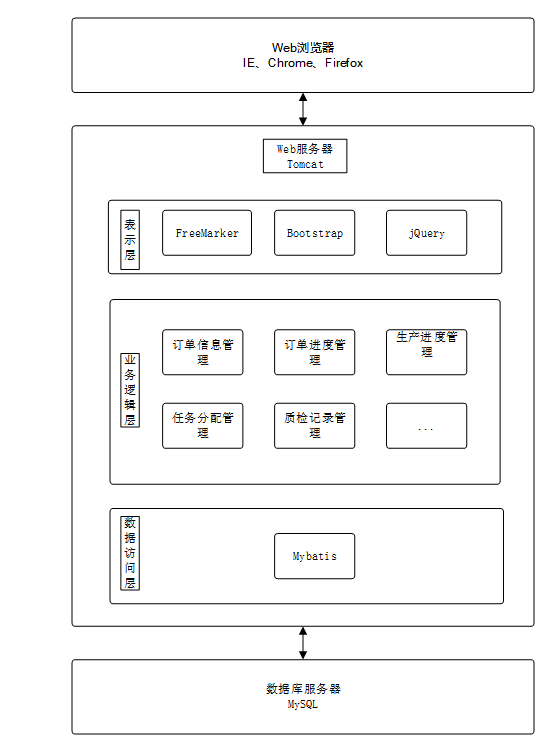 系统由表现层、业务逻辑层、数据访问层和数据库服务器组成。表现层通过浏览器(如IE、Chrome、Firefox)与用户交互,采用FreeMarker、Bootstrap、jQuery等技术实现界面呈现。业务逻辑层负责处理系统的核心业务逻辑,通过分模块设计实现功能分离。数据访问层使用MyBatis框架连接数据库,执行数据的增删改查操作。数据库服务器采用MySQL进行数据存储和管理,为系统提供稳定的数据库支持。整个架构通过Tomcat服务器完成用户请求的接收和处理,确保系统的高效运行[8]。整个系统架构如图4-1所示。