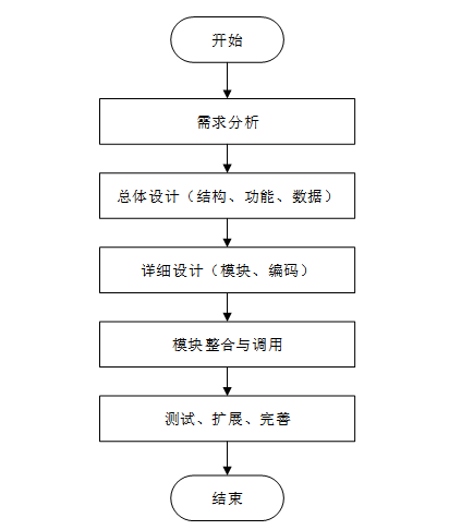 系统开发流程的主要步骤,从需求分析到系统完成的全过程。流程包括需求分析、总体设计(结构、功能、数据)、详细设计(模块、编码)、模块整合与调用,以及测试、扩展和完善,最终完成系统的开发。本系统的开发流程如图3-3所示