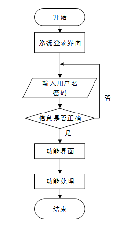 用户首先进入系统登录界面,输入用户名和密码后,系统验证信息是否正确。若验证失败,返回登录界面重新输入;若验证成功,则进入功能界面,执行相应功能处理后结束操作流程。操作流程如图3-5所示。