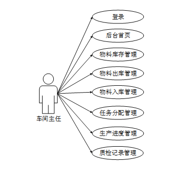 车间主任包登录、后台首页、物料库存管理、物料出库管理、物料入库管理、任务分配管理、生产进度管理、质检记录管理等功能。