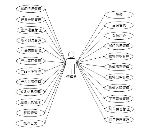 管理员凭借专属账号登录、系统包含登录、后台首页、系统用户、部门信息管理、物料类型管理、物料库存管理、物料出库管理、物料入库管理、工艺路线管理、订单信息管理、订单进度管理、车间信息管理、任务分配管理、生产进度管理、质检记录管理、产品类型管理、产品库存管理、产品出库管理、产品入库管理、设备信息管理、维修记录管理、权限管理、操作日志等功能。