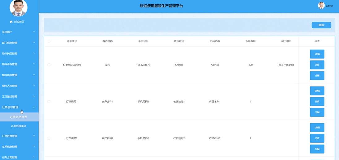 管理员对全企业的订单进行统一管理,协调订单资源,包括订单的汇总分析、订单与生产计划的匹配、订单异常情况的处理等,提高订单处理的效率和准确性。订单信息管理界面如图如下图所示。