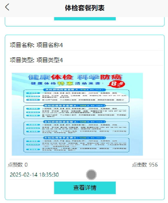 | 1 | 进入体检套餐页面查看所有套餐信息 | 成功展示套餐列表 |