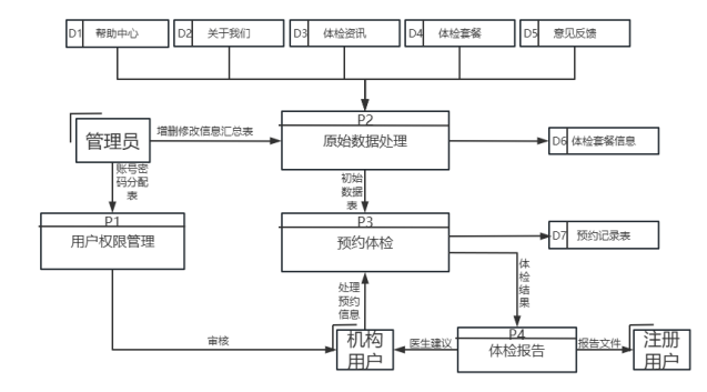 综上所述,平台应支持多方协作,满足不同用户群体的需求,提供一体化的健康管理服务,确保系统的稳定性、安全性和高效性。顶层数据流图如图3-1所示。