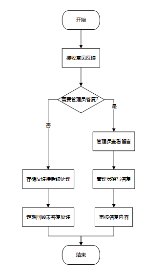 管理员可以对每条反馈进行回复,说明解决方案或进一步的处理步骤,并根据反馈内容对平台功能或服务进行优化调整。管理员回复后,系统会自动通知用户,确保用户能够及时了解反馈处理结果。流程图如下图所示。