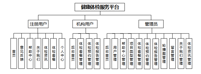 平台主要包括用户端、机构端和管理员端三个部分。用户端提供体检套餐浏览、预约、报告查询、健康资讯等功能;机构端主要用于管理体检套餐、处理预约记录、上传体检报告;管理员端则负责用户管理、数据审核、报告管理等后台操作。