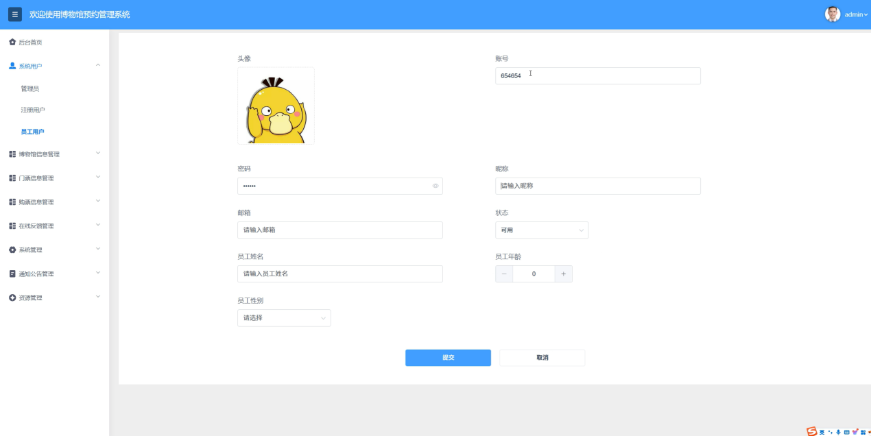 管理员可以通过系统用户管理功能,对所有用户进行集中管理。这包括管理员账户、注册用户和员工用户的创建、权限分配、信息修改和账号禁用等操作。管理员可以查看用户的注册信息、登录记录和使用行为,确保系统的用户管理规范有序。系统用户管理界面如图5-8所示。