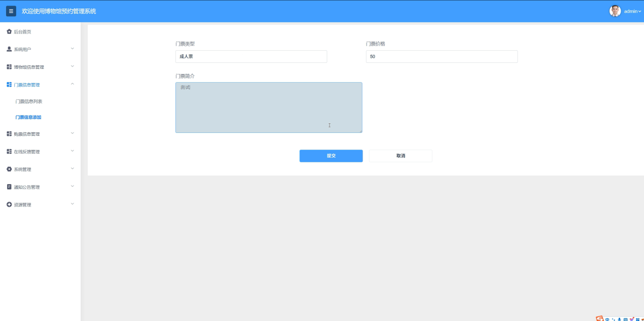管理员能够全面掌控门票的详细信息。管理员可以添加新的门票类型,设置门票的价格、有效期、适用展览等信息。同时,管理员还可以编辑已有的门票信息,根据展览安排和市场策略调整门票内容。门票信息管理如图5-9所示。