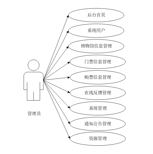 管理员的功能包括后台首页、系统用户(管理员、注册用户、员工用户)、博物馆信息管理、门票信息管理、购票信息管理、在线反馈管理、系统管理(轮播图管理)、通知公告管理、资源管理(新闻资讯、资讯分类)。管理员用例图如图3-3所示。