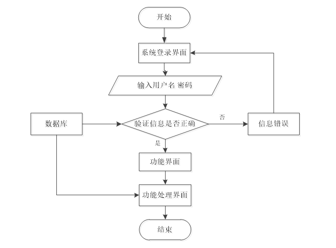 用户从“系统登录界面”开始,输入用户名和密码后,系统验证其信息是否正确。如果验证通过,则进入功能界面并进一步进入功能处理界面,最后流程结束;如果验证失败,则显示“信息错误”,用户需要重新输入。数据库支持验证过程。如图3-4所示。