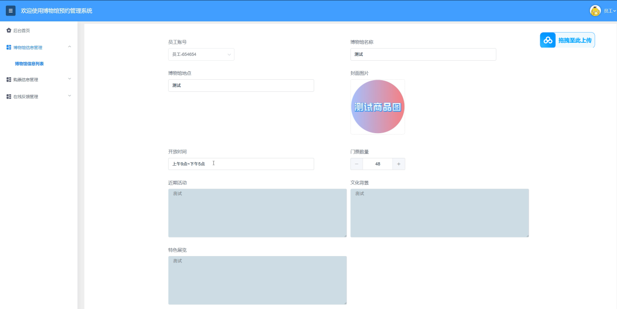 | 博物馆信息管理测试 | 登录系统,进入博物馆信息管理页面,编辑已发布的展览信息,更新展览内容 | 无 | 符合预期 |