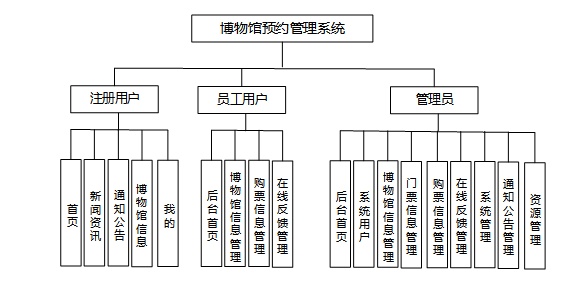 员工用户能在后台首页对博物馆信息、购票信息、在线反馈进行管理,确保日常运营工作高效开展。注册用户则可在首页浏览新闻资讯、通知公告和博物馆信息,在 “我的” 页面管理基本信息、收藏感兴趣内容、查看购票信息,还能通过在线反馈功能与博物馆互动。