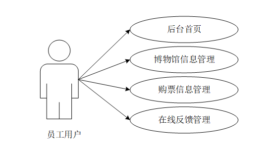 员工用户的功能包括后台首页、博物馆信息管理、购票信息管理、在线反馈管理。员工用户用例图如图3-2所示。