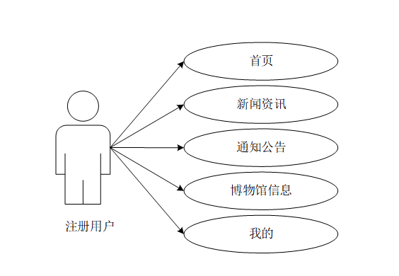 注册用户的功能包括首页、新闻资讯、通知公告、博物馆信息、我的(基本信息、收藏、购票信息、在线反馈)注册用户用例图如图3-1所示。
