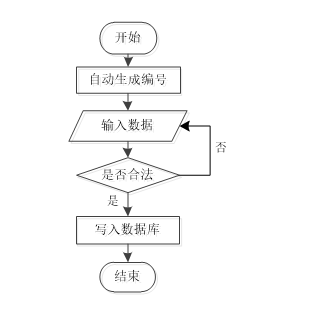 系统开始后自动生成编号,用户输入数据。系统判断输入的数据是否合法,若不合法则返回重新输入;若合法,则将数据写入数据库,最后结束流程。如图3-6所示。
