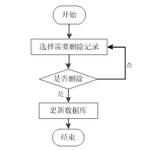 用户首先选择需要删除的记录,然后系统判断是否执行删除操作。如果用户选择不删除,则返回重新选择;如果选择删除,则更新数据库完成记录删除操作,最后结束流程。如图3-7所示。