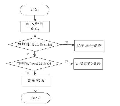 用户输入账号和密码后,系统首先判断账号是否正确,若不正确则提示“账号错误”;如果账号正确,则继续判断密码是否正确,若密码错误则提示“密码错误”;若账号和密码均正确,则显示“登录成功”,最后结束流程。如图3-5所示。