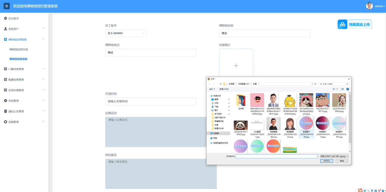 管理员负责管理博物馆的展览信息、开放时间、门票价格等。系统支持添加、编辑和删除展览信息,确保用户获取的信息准确无误。管理员还可以上传展览的图片和视频资料,丰富展览内容,提升用户的参观体验。博物馆信息管理界面如图5-10所示。