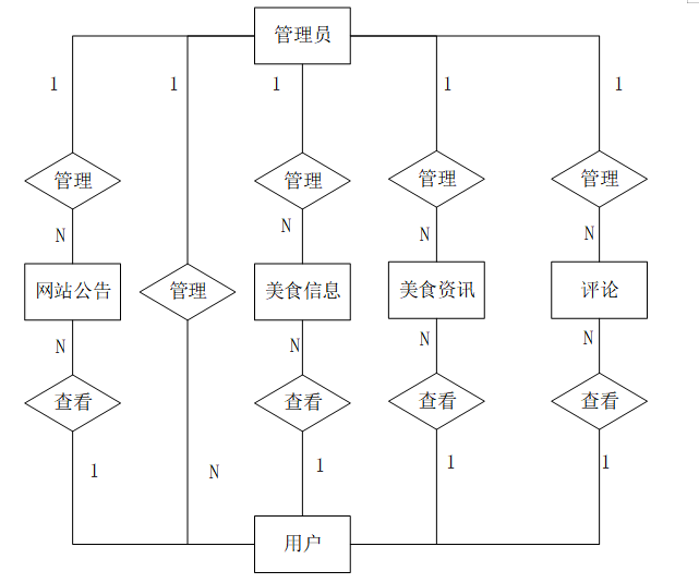 借助先进的系统,E-R图使其他用户可以快速轻松地了解系统的功能以及他们之间的关系。根据美食推荐系统分析结果,本美食推荐系统总体E-R图如下图所示。