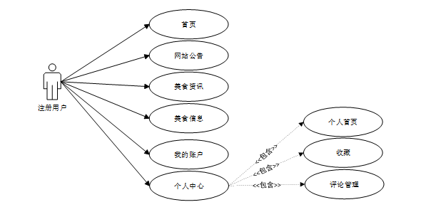 用户通过平台可以轻松浏览到最新的美食推荐、餐厅信息以及优惠活动等,通过首页、网站公告、美食资讯等功能获取及时的饮食信息,同时还能管理个人账户,查看订单、收藏餐厅与菜品,参与评论和互动,提升个性化体验。整体而言,平台为用户提供了一个便捷、高效的餐饮信息获取与管理中心,让用户能够随时随地做出理想的就餐决策,并享受个性化的服务和推荐。注册用户角色用例图如下所示。