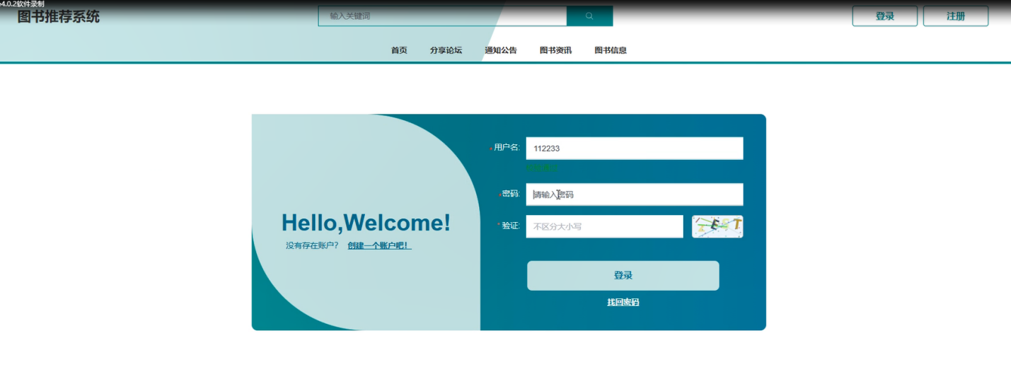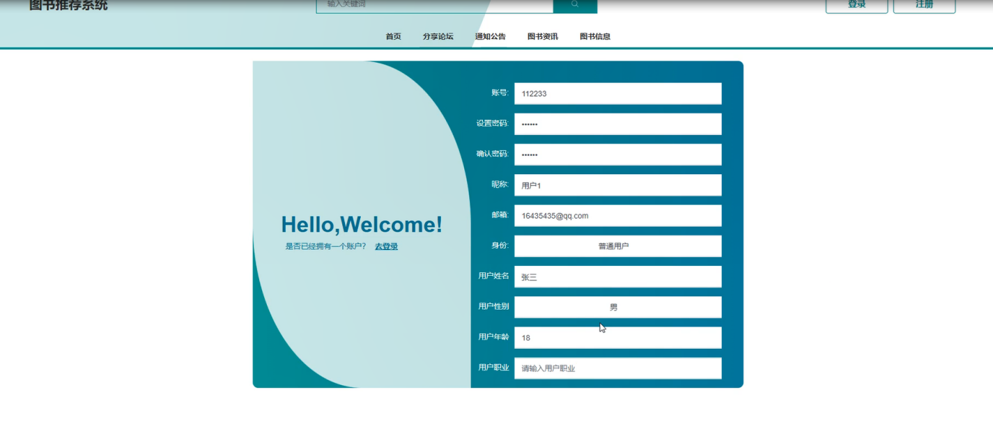 注册登录:注册用户需要浏览图书推荐信息需要注册账号密码,包括设置账号、密码、昵称、邮箱等信息,注册后用账号密码登录即可。