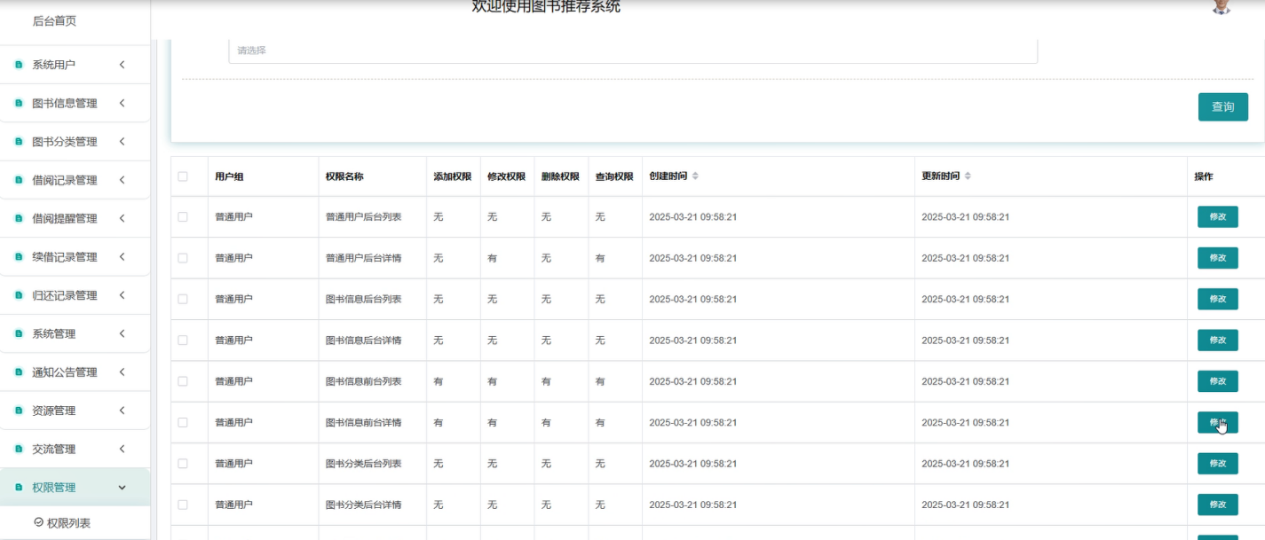 权限管理:管理员可以管理所有用户的使用权限、可以进行修改添加删查的操作。其界面如下图所示。
