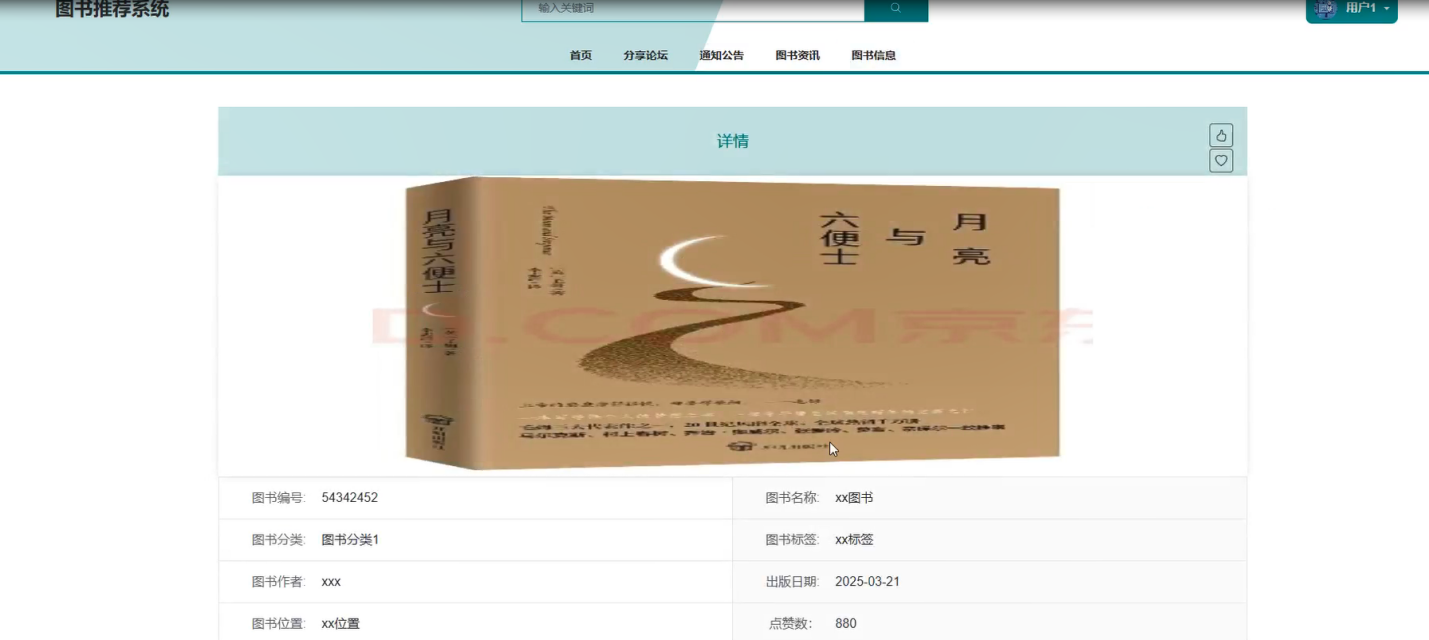 图书信息:用户可以浏览图书信息列表并查看详情,可以点击借阅、输入借阅信息,也可以进行点赞、收藏和评论等操作。