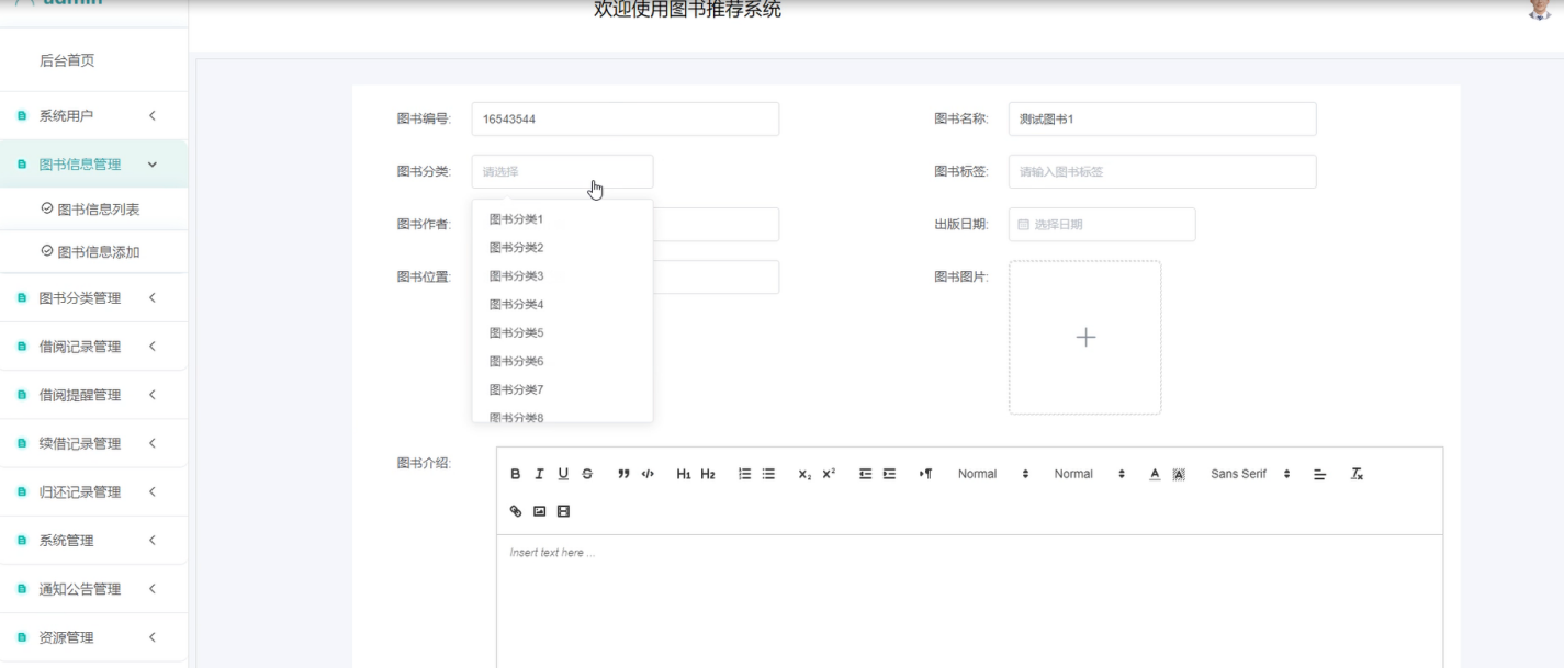 图书信息管理:管理员可以查看图书信息列表及添加详情,包括图书编号、名称、分类、图书作者、出版日期、详情介绍等信息,可以进行增删改查的操作。