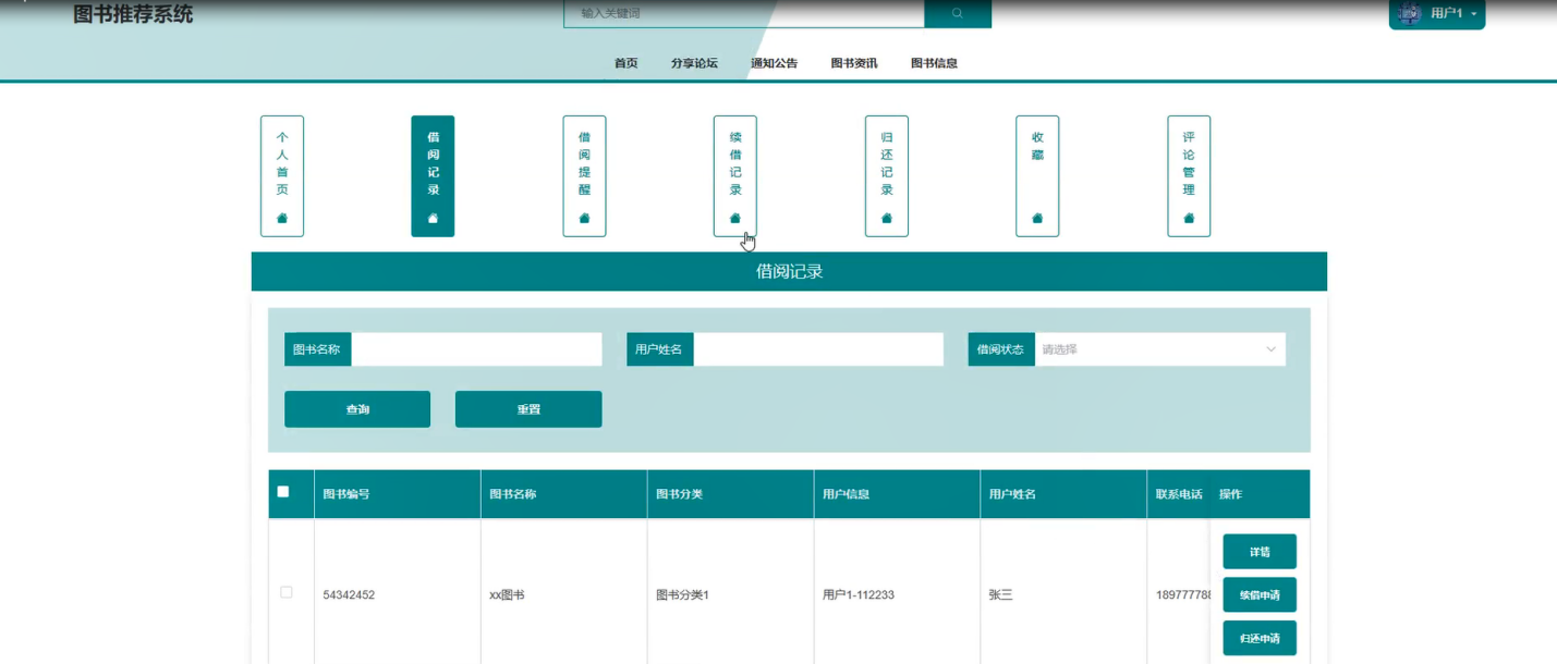 借阅记录管理:管理员可以查看所有借阅记录列表详情信息,可以点击发送提醒,续借申请管理等。